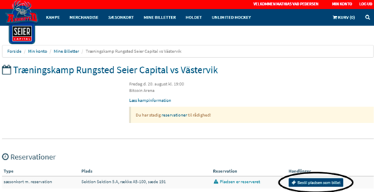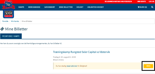 For at få billet til kampen skal du derefter trykke på den gule knap “BRUG”, hvorefter du vil ført videre siden hvor du nu har brugt din reservation: