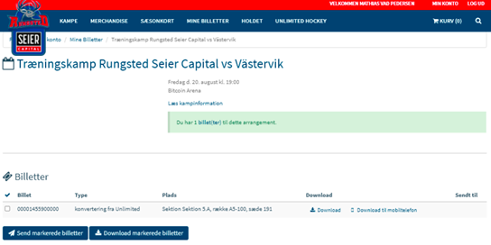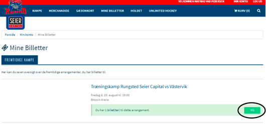 Når du har købt eller hentet billet vil du kunne se dine billetter under “Mine billetter” og det ser sådan her ud: (hvis den ikke ser sådan ud skal du hente billetten. Se guide oven over)